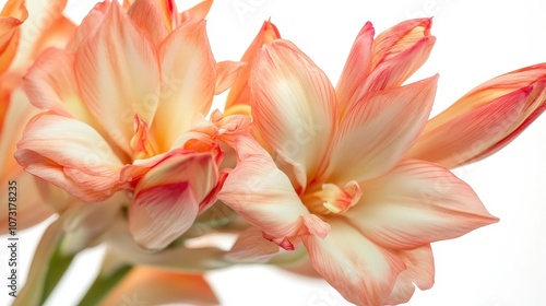 Fototapeta premium Elegant amaryllis blooms with soft peach petals on white background