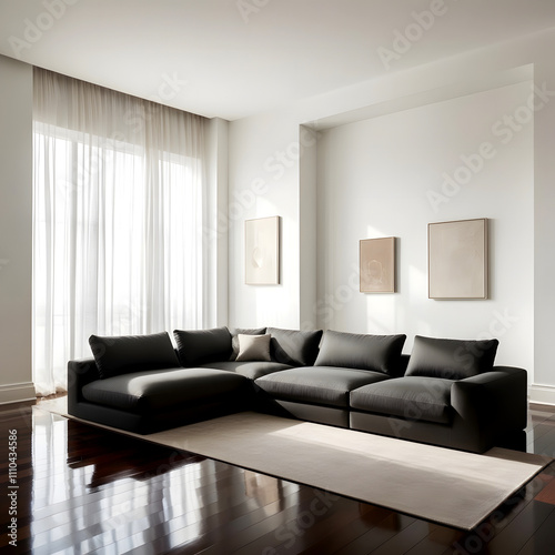 © Noorjahan, Fototapeta premium Elegant and airy modern living room interior with a sleek, low-profile, charcoal grey sectional sofa placed against a crisp white wall