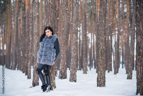 Naklejka premium Elegant and casual female beauty. Attractive lady in grey fur coat, nice girl in park, lifestyle of woman, pretty arabic face