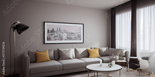 © Interior Stock Photo, Obraz premium Elegant and comfortable designed living room with big corner sofa. Interior design modern apartment. Generative AI.