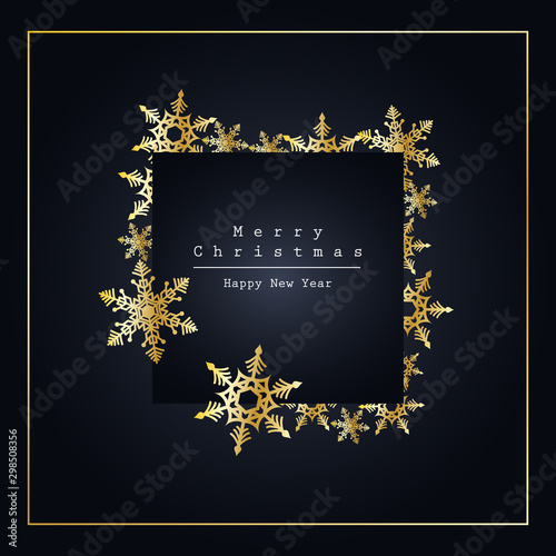 Fototapeta premium Elegant and minimalist Christmas card or poster design. Gold snowflakes on dark background. Square format