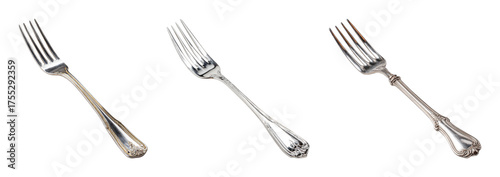 Fototapeta premium Elegant antique silver forks with intricate detailing, studio shot with dramatic lighting and minimalist composition, ideal for culinary, hospitality, and vintage design projects, PNG set with tran...