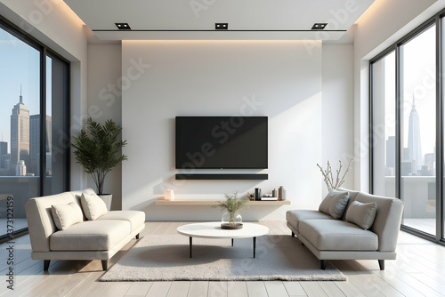 © Gustav, Fototapeta premium Elegant Apartment Living Room with City Views, Modern Furnishings, Minimalist Design, and a Relaxing Ambiance, Ideal for Real Estate and Interior Design Projects
