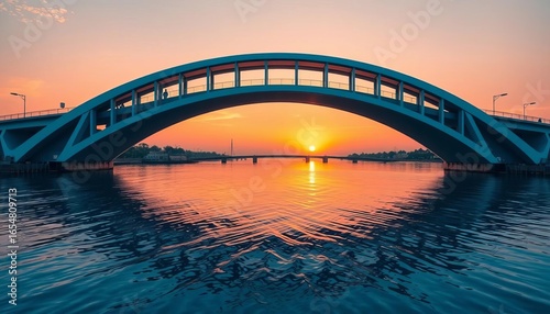 Naklejka premium Elegant arch bridge spanning calm blue water, sunset sky reflection,...