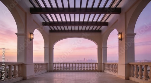 Fototapeta premium Elegant arched balcony with a stunning sunset sky view over the ocean.