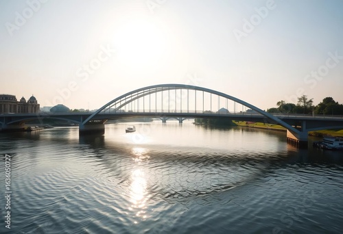 Naklejka premium Elegant arched bridge spans calm river, reflecting sun, river, bridge