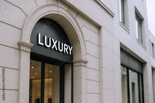 © The Little Hut, Obraz premium Elegant architectural facade featuring an arched entrance, showcasing architectural design and sophisticated urban aesthetics