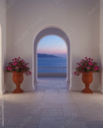 © Gustav, Obraz premium Elegant Archway Opens to Serene Ocean Sunset with Blooming Flowers on Balcony