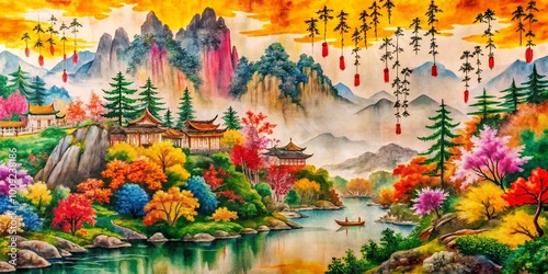 © Man888, Fototapeta premium Elegant Asian Calligraphy Painting on Rice Paper with Traditional Brushstrokes and Rich Colors