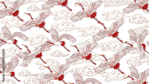 Fototapeta premium Elegant Asian Inspired Seamless Pattern with Graceful Flying Cranes Amidst Stylized Cloud Motifs, Capturing Traditional Artistry and Serenity in a Repeating Design