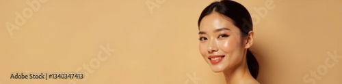 Obraz premium Elegant Asian woman with luxurious makeup, beige background, sophistication,...