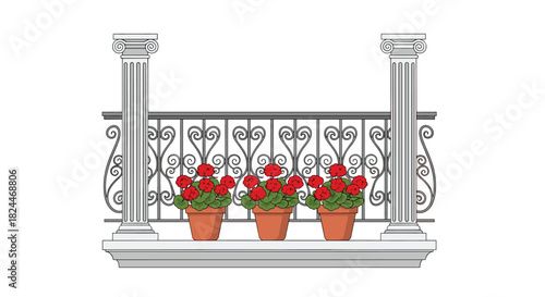 © Naim, Obraz premium Elegant balcony with vibrant red geraniums in terra cotta pots adding charm to a classic architectural design for stylish home decor