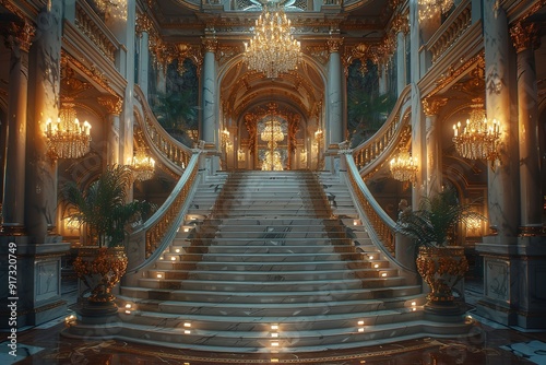 © SC-7, Obraz premium "Elegant Ballroom Featuring Crystal Chandeliers, Ornate Columns, and a Grand Staircase in an Opulent Formal Setting."