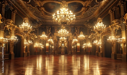 © Sanych, Obraz premium Elegant ballroom with grand chandeliers and dancers, 4K hyperrealistic photo.