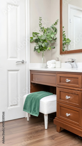Fototapeta premium Elegant bathroom with chestnut vanity and lush greenery for relaxing ambiance