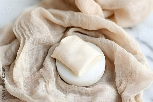 Obraz premium Elegant beige fabric draped artfully, showcasing a smaller off-white fabric square on a white pedestal. Soft, neutral tones and textures.
