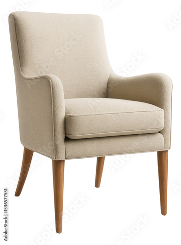© OMD, Naklejka premium Elegant beige upholstered armchair with wooden legs and curved armrests on transparent background.