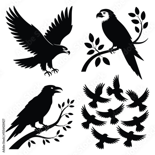 © Mahfuz, Obraz premium Elegant Bird Silhouettes: Eagle, Parrot, Raven, and Flock Designs