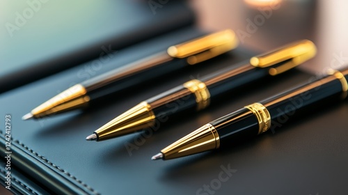 Fototapeta premium Elegant black and gold pens arranged on a sleek leather notebook, soft...