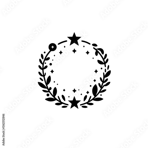Fototapeta premium Elegant Black and White Circular Design: Starry Wreath with Leaves, Dots, and Stars on a White Background