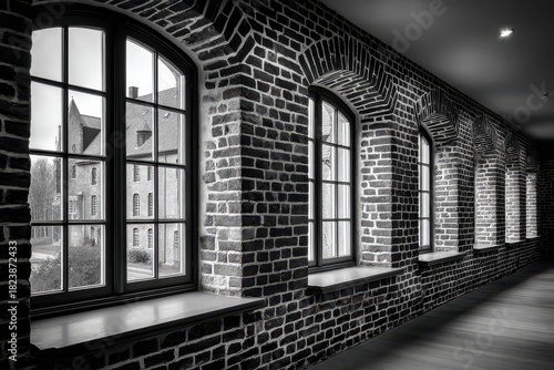 Obraz premium Elegant black and white corridor with arched windows revealing a historic...