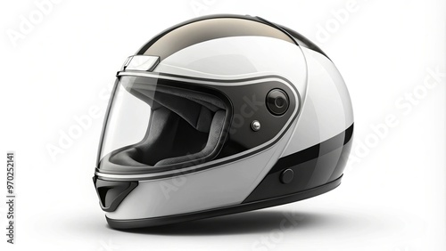 © Caitlin, Fototapeta premium Elegant black and white motorcycle helmet with visor up sits confidently on a crisp white backdrop.