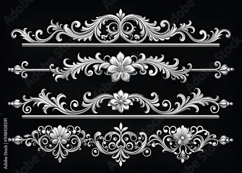 Fototapeta premium Elegant black and white Victorian wedding page dividers featuring delicate...