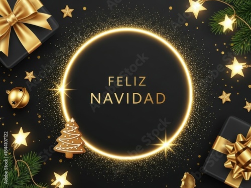 © MDJABBAR, Naklejka premium Elegant black background with glowing golden circle frame, stars, gift box, and gingerbread cookie for a festive feliz navidad greeting