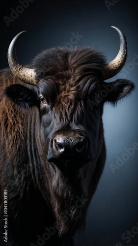 Naklejka premium elegant black buffalo portrait in a dark room professional photo