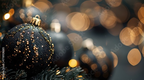 © tanawatbig, Fototapeta premium Elegant Black Christmas Ornament with Gold Accents and Bokeh Lights