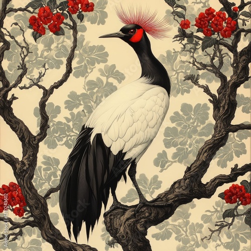 © Ali, Fototapeta premium Elegant black-crowned crane perched on branch, red flowers