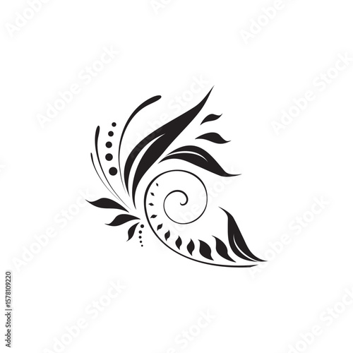 Obraz premium Elegant black floral swirl design, stylized leaves and dots, decorative element.
