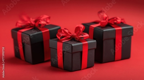 © nameera_hasan, Obraz premium elegant black gift boxes red bows