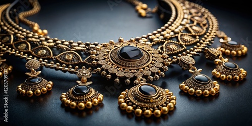 © Wanlop, Obraz premium Elegant Black & Gold Jewelry Set on Dark Background - Stock Photo