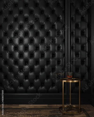 Obraz premium Elegant Black Leather Tufted Wall with a Side Table and Whiskey Glass in a...