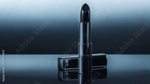 Fototapeta premium Elegant Black Lipstick Tube with Silver Accents on Reflective Surface in Studio