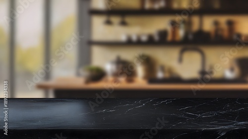 Obraz premium Elegant black marble tabletop display showcasing warm kitchen details a...