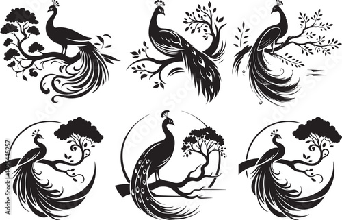 Obraz premium Elegant black peacock silhouettes on trees, birds, nature, design elements