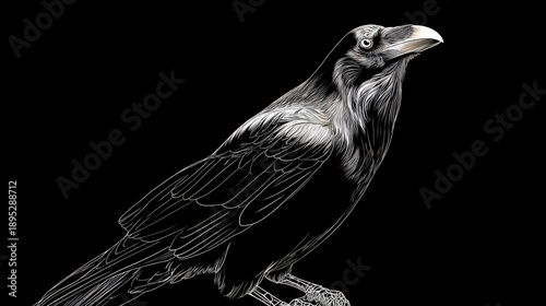 © Thinnawat, Obraz premium Elegant black raven with intricate line art on dark background