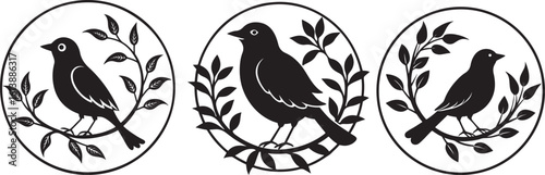 © mdsabbir, Obraz premium Elegant Black Silhouette of a Bird Perched on a Branch within a Circle
