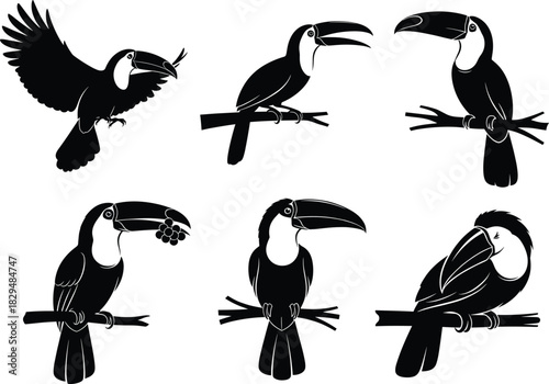 © MDRAZIURRAHMAN, Obraz premium Elegant black silhouette toucan bird illustrations perched on branches, expressive tropical wildlife vector design set for nature themes, decorative art, and creative projects