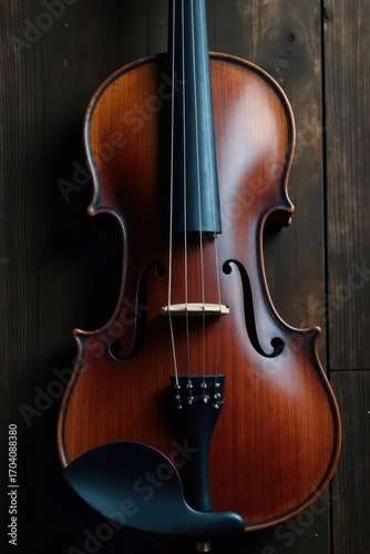 Fototapeta premium Elegant black violin, intricate details, dark wood grain, string, score,...