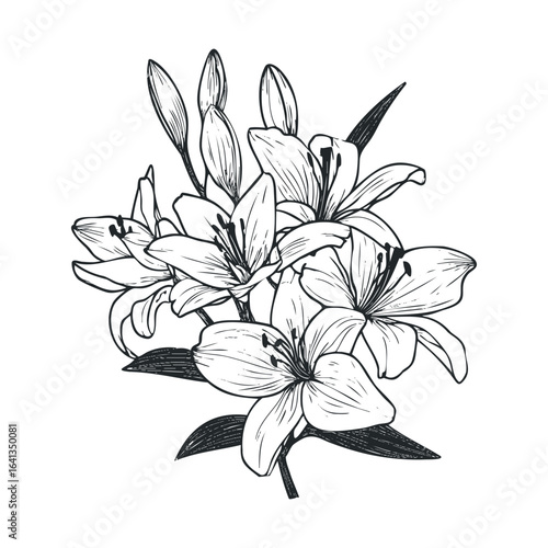 Fototapeta premium Elegant blooming lilies in a detailed floral design for decoration. Vector retro hand drawn illustration