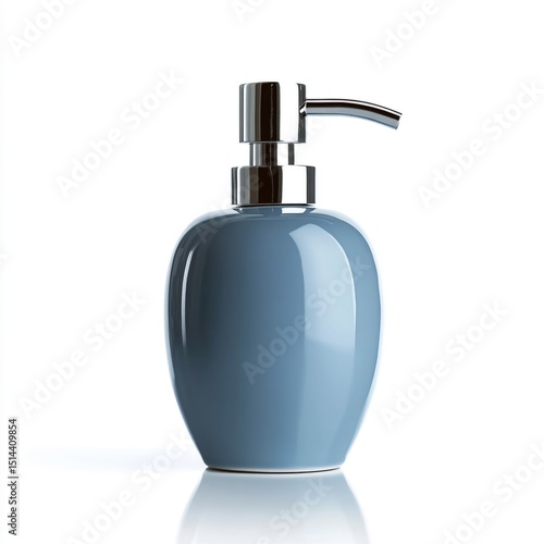 © farjana, Obraz premium Elegant blue soap dispenser with shiny chrome pump on a clean white background