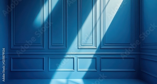 Fototapeta premium Elegant Blue Wall Interior with Geometric Patterns and Soft Shadows, Perfect...