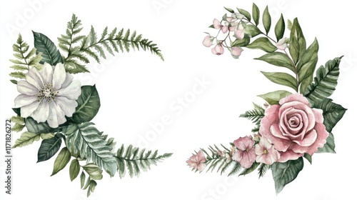 Fototapeta premium Elegant Boho Watercolor Wedding Frame with Tropical Flora: Roses, Ferns, and...