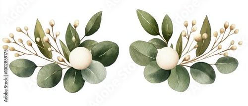 Naklejka premium Elegant botanical composition featuring green leaves and delicate white berries, perfect for decoration and floral designs.