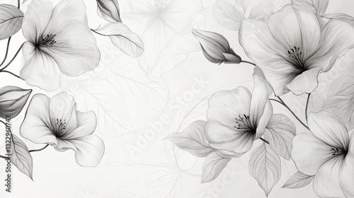 © Chaikit, Obraz premium elegant botanical line art collection, delicate pencil sketches, minimalist floral elements, soft gray tones, detailed flower stems and leaves, vintage herbarium style, fine continuous lines, clean