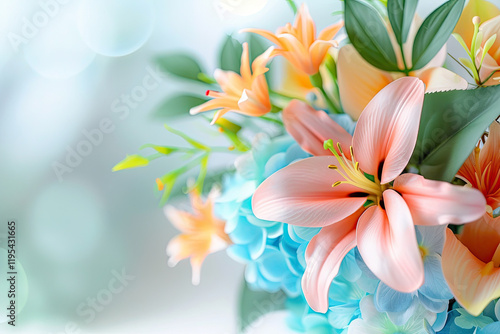 Naklejka premium Elegant bouquet of lilies and hydrangeas with soft bokeh