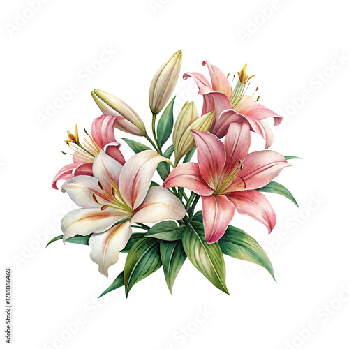 Naklejka premium Elegant Bouquet of Pink and White Lilies with Lush Green Leaves Artwork